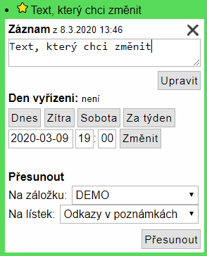 Zde je možné změnit poznámku nebo k poznámce přidat datum splnění.